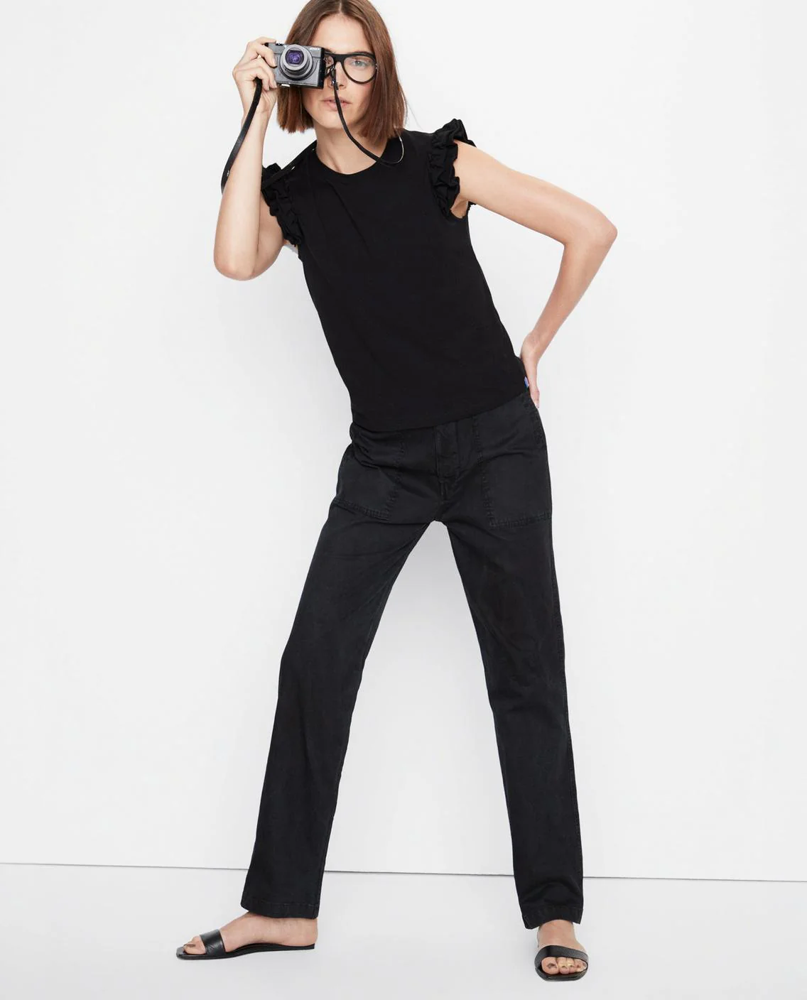 Let's have a Kiki ;) Like with potato chips, a ruffle is always better, so we added ruffles to the shoulders of this sleeveless tee. Instantly spices up your look!