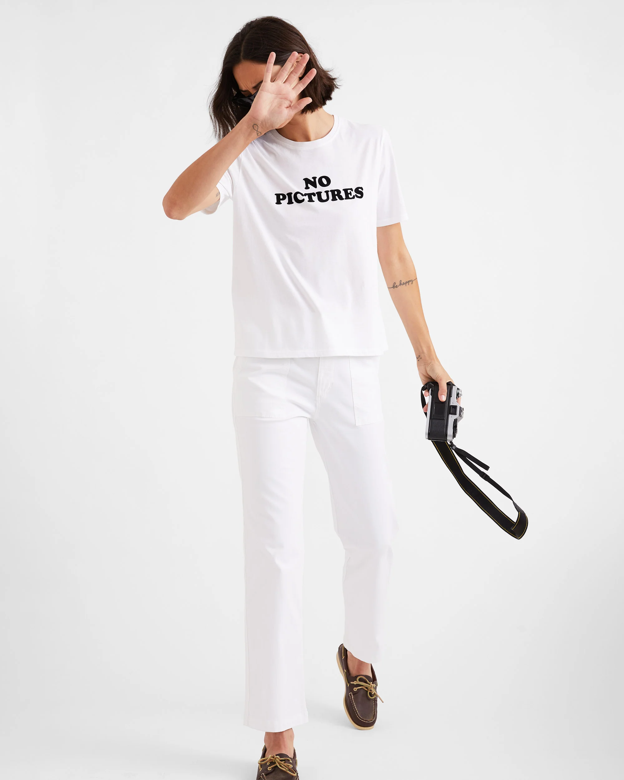 Embrace the moment IRL. The Modern No Pictures says it all. Made from soft 100% organic cotton, this classic tee features flocked lettering for a subtle, tactile finish. Easy, graphic, and quietly opinionated.