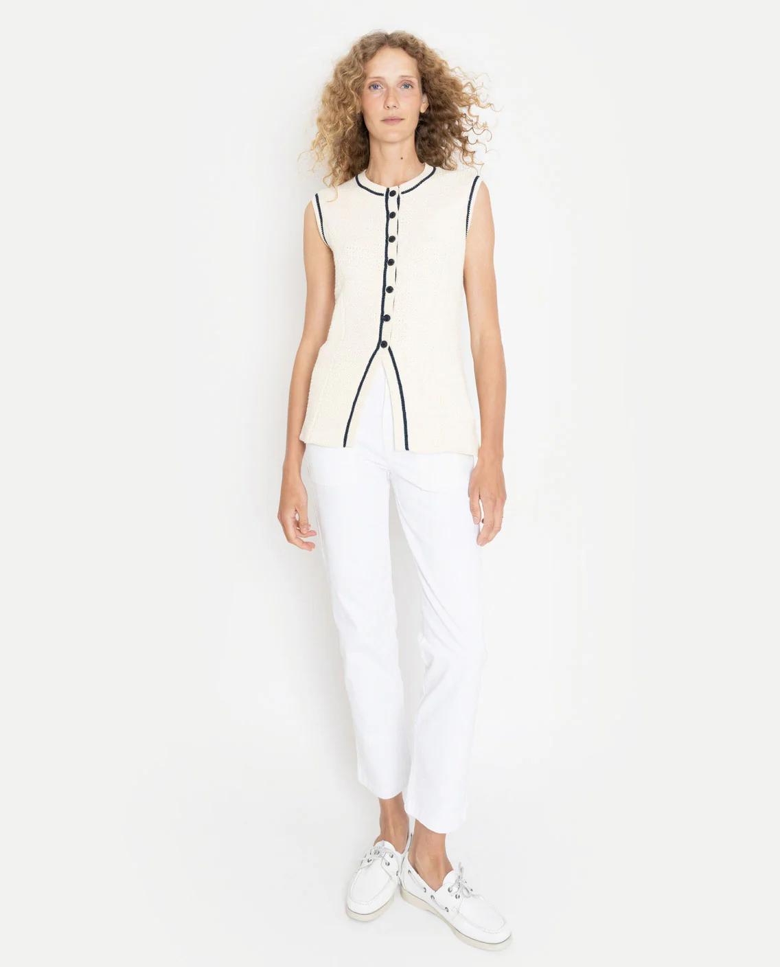 We’ll be the first to admit the word “chic” is overused. But in the case of The Olivia, an elongated crochet sweater vest with contrasting piped trim, it totally applies. The button-front crewneck and split placket hem have a dramatic effect that will get you all the right attention. No fishing for compliments here.